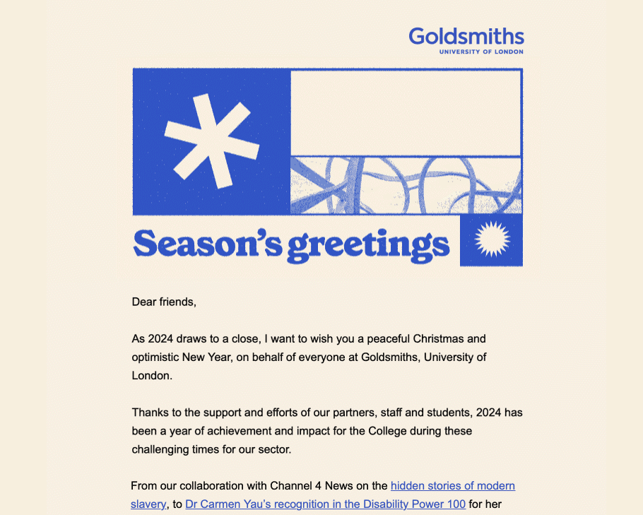 An animated gif and email design to celebrate the achievements of staff and students of Goldsmiths, University of London.